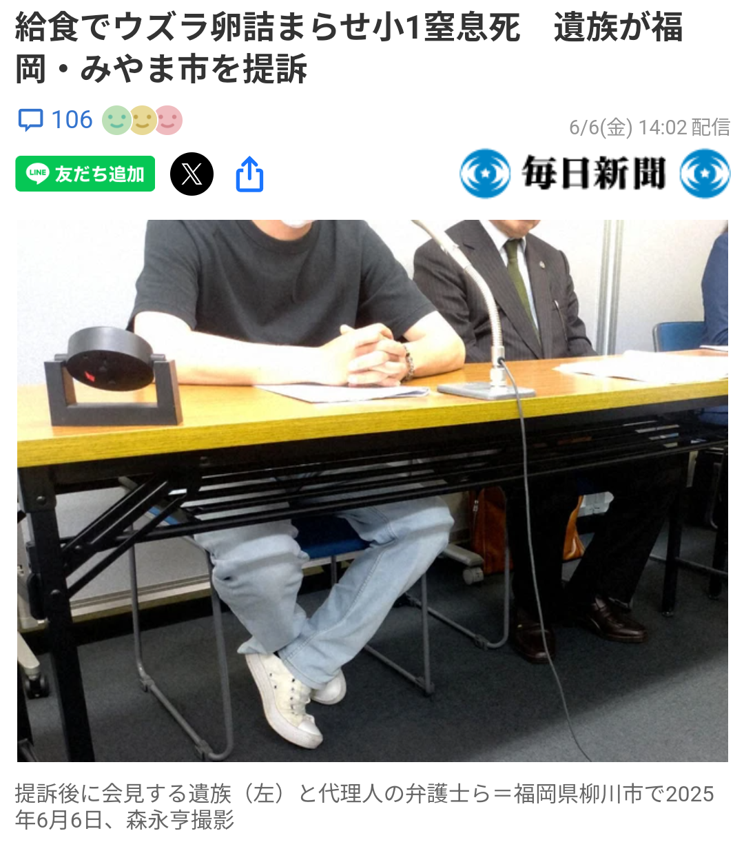 福岡県みやま市の市立小学校で2024年2月、1年生の男児(当時7)が給食で出たウズラの卵をのどに詰まらせ死亡した事故で、男児の父親が6日、市に6千万円の損害賠償を求め福岡地裁柳川支部に提訴した。事故は学校側の不注意などによるものだったと訴えている。