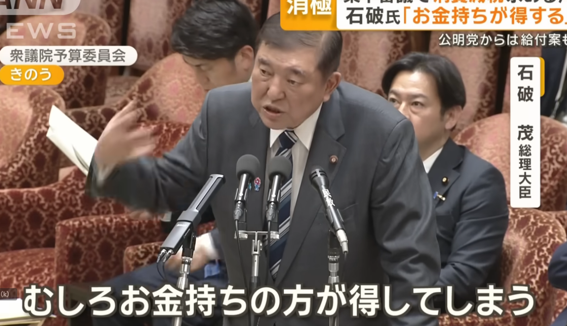 石破総理「消費減税はお金持ちの方が得してしまう。」(動画あり)