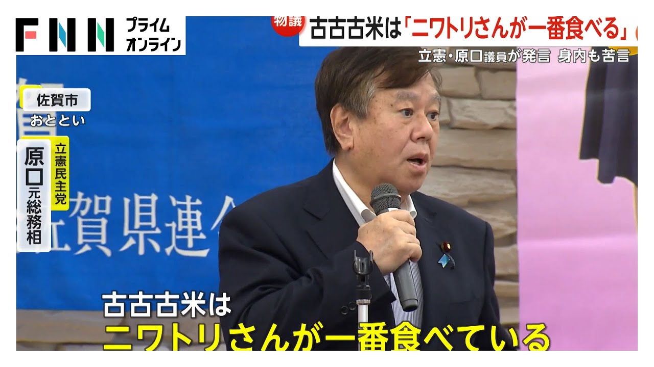 7日に佐賀県で行われた集会で、原口氏は「コメ、古古古米、あんなに恩着せられて買うもんですか?あれ5キロ83円ですよ。83円で2000円以上で売ってるわけです」と語った。「本当のこと言っちゃいけないんですか?古古古米はニワトリさんが一番食べてるんですよ。人間様は食べてないですよ。恐ろしいでしょ?私たちの言葉を奪いにきている」と発言した。