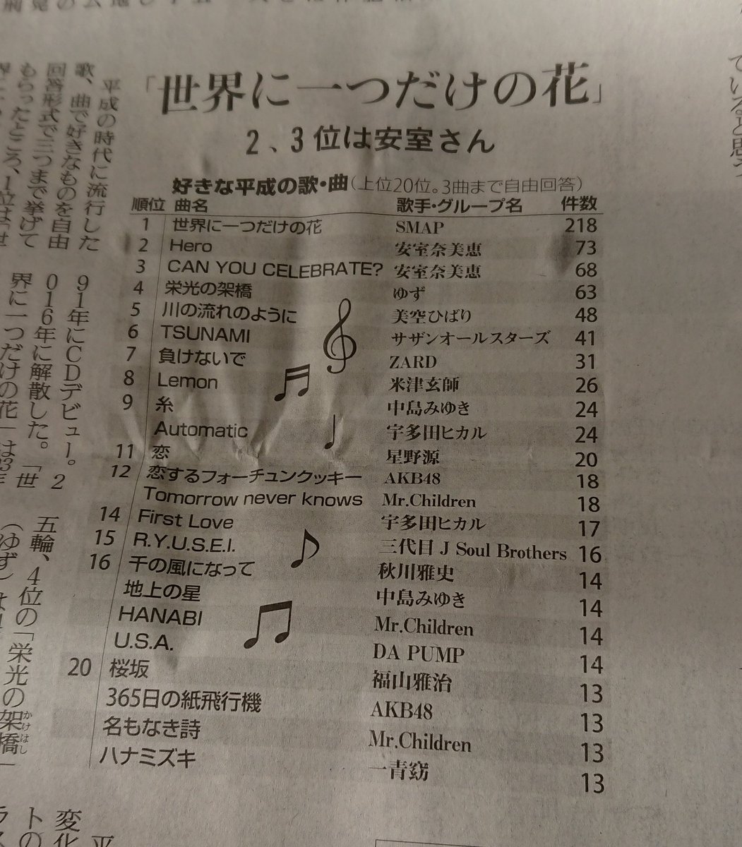 好きな平成の歌・曲ランキング TOP20 (読売新聞の「平成時代」特集より)