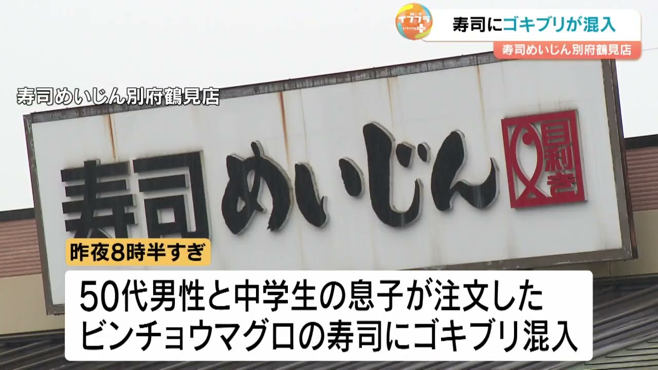 大分を拠点に展開する回転寿司チェーン「寿司めいじん」別府鶴見店で、客に提供した握り寿司にゴキブリが混入していたことがわかりました。寿司めいじんによりますと、6月11日午後8時すぎ、50代の男性と中学生の息子が注文したビンチョウマグロの握り寿司にゴキブリが混入していました。