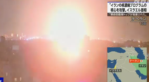 イスラエル軍は13日、イラン各地にある核関連施設など数十の軍事目標を攻撃したと発表し、ネタニヤフ首相は「イランの核濃縮プログラムの核心を攻撃した」としています。その後、イスラエル軍はイランから100機以上の無人機がイスラエル側に向けて発射されたと発表しました(略)