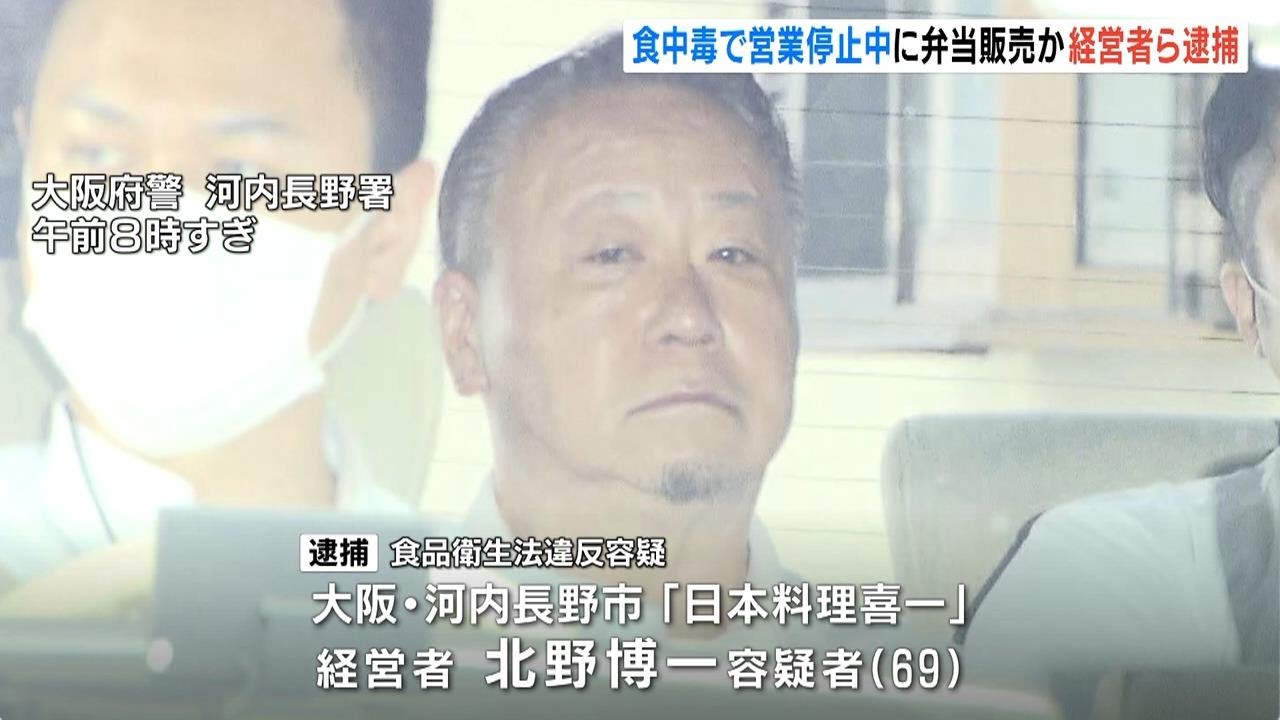 食中毒を出して営業停止命令を受けたにもかかわらず、処分期間中に営業を続けたとして、大阪府警は16日、食品衛生法違反容疑で大阪府河内長野市の飲食店「日本料理 喜一」代表取締役北野博一容疑者(69)=河内長野市=ら3人を逮捕した。捜査関係者への取材で分かった。捜査関係者によると、店は、レストランなどの格付け本「ミシュランガイド」に掲載されたこともあった。