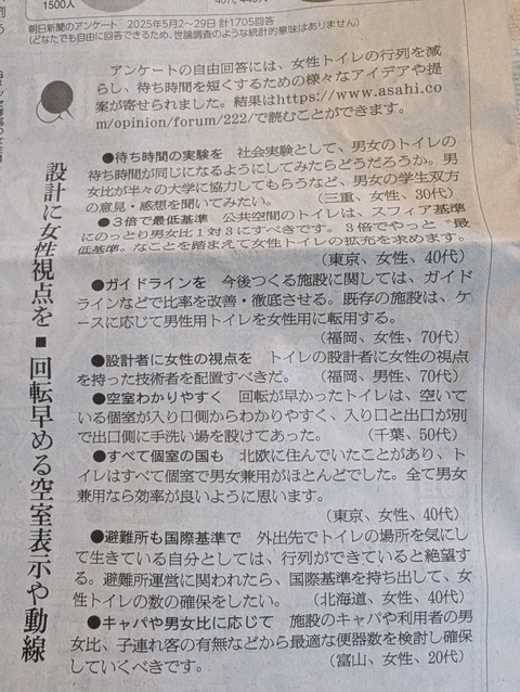 女さん「トイレは男女比1:3にすべき。3倍でやっと“最低基準”」