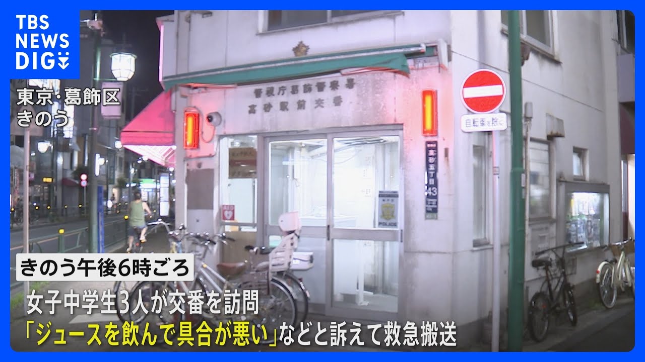 警視庁などによりますと、20日午後5時すぎ、東京 葛飾区の高砂駅前にある交番に女子中学生3人がやって来て「飲み物を飲んだら具合が悪くなった」と(略)