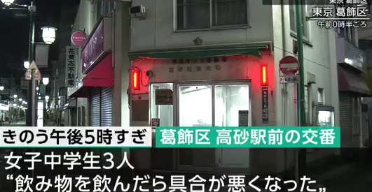 警視庁などによりますと、20日午後5時すぎ、東京 葛飾区の高砂駅前にある交番に女子中学生3人がやって来て「飲み物を飲んだら具合が悪くなった」と(略)