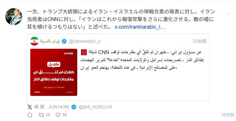 【ワシントン共同】トランプ米大統領は23日、イスラエルとイランが完全な停戦合意に至ったと交流サイト(SNS)に投稿した (略)