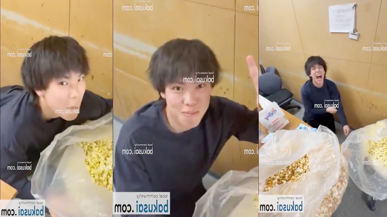 拡散された動画には、若い男性がふざけながら、ポップコーンが大量に入った袋に顔を入れる様子が映っている。