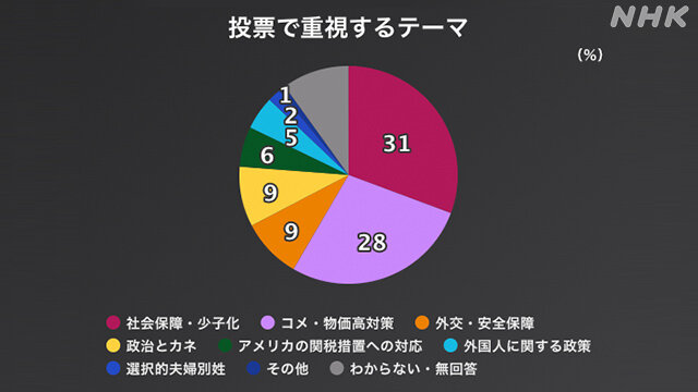 「社会保障・少子化」が31%、「コメ・物価高対策」が28%、「外交・安全保障」と「政治とカネ」がともに9%、「アメリカの関税措置への対応」が6%、「外国人に関する政策」が5%、「選択的夫婦別姓」が2%でした。