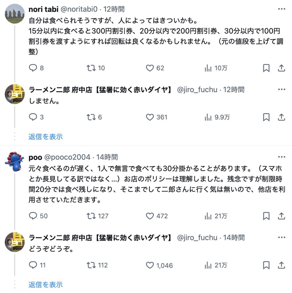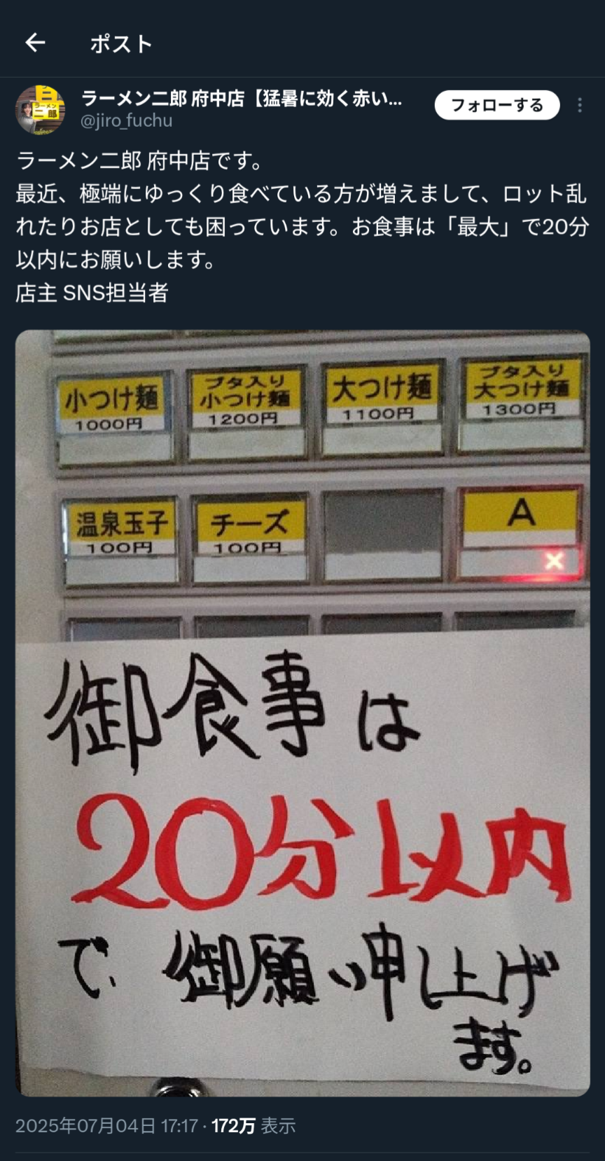 ラーメン二郎さん「最近、極端にゆっくり食べている方が増えまして、ロット乱れたりお店としても困っています。お食事は「最大」で20分以内にお願いします。」