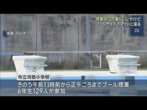 滋賀県守山市の市立河西小学校で、9日午前、屋外で行われたプールの授業で児童が尻に軽いやけどを負い、6年生の児童あわせて62人が病院を受診しました。プールに入る順番待ちで、プールサイドに座っている間にやけどしたとみられています。
