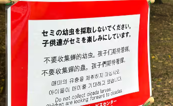 園内には至る所に注意書きの張り紙が目につく。「セミの幼虫を採取しないでください。子供達がセミを楽しみにしています」。