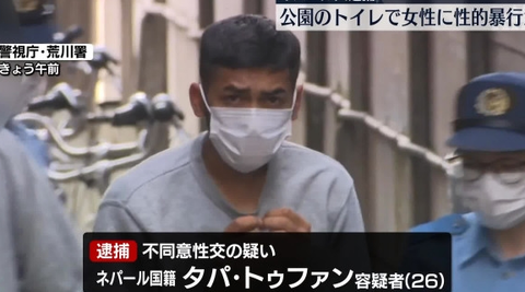公園のトイレで女性にわいせつな行為をしたとして、警視庁荒川署は16日、不同意性交の疑いで、ネパール国籍で東京都中野区、職業不詳、タパ・トゥファン容疑者(26)を逮捕した。