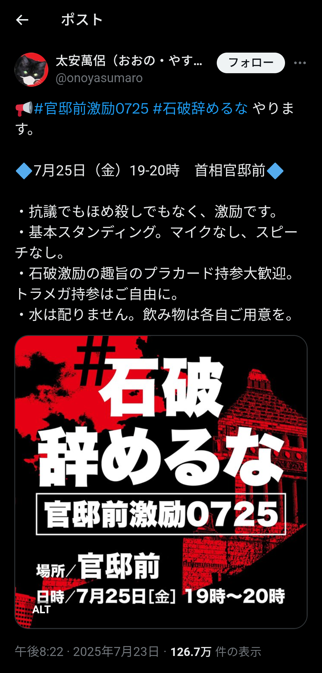 退陣論が浮上した石破茂首相(自民党総裁)を巡って、25日午後7時から首相官邸前で激励デモ「#石破辞めるな 官邸前激励0725」が予定されている。