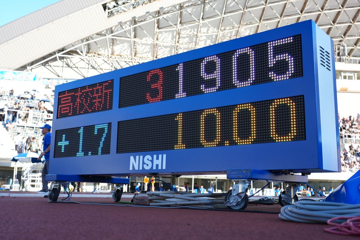 従来の桐生祥秀(洛南)の記録、10秒01を0秒01塗り替えた。