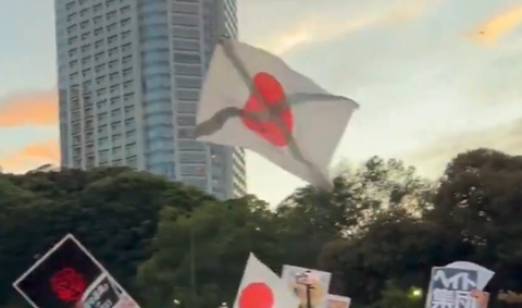 へずま氏は、SNS上で拡散されている、日本国旗に黒いバツ印をつけて掲げられた写真を添付。参院選で「日本人ファースト」を唱えた参政党のさや氏の街頭演説に抗議する人らが掲げた、東京・渋谷駅前で撮られた写真と思われる。