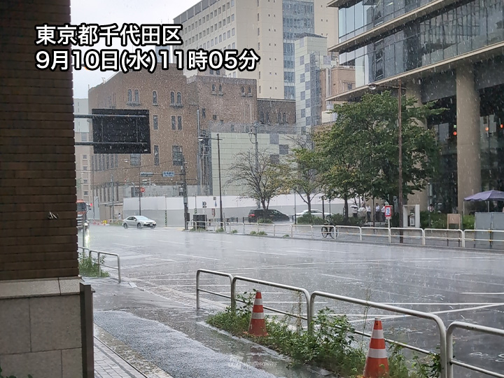 今日10日(水)の関東は大気の状態が非常に不安定で、午前中から雨雲の発達している所があります。都心周辺でも雨雲が急発達し、一部では土砂降りの雨です。
