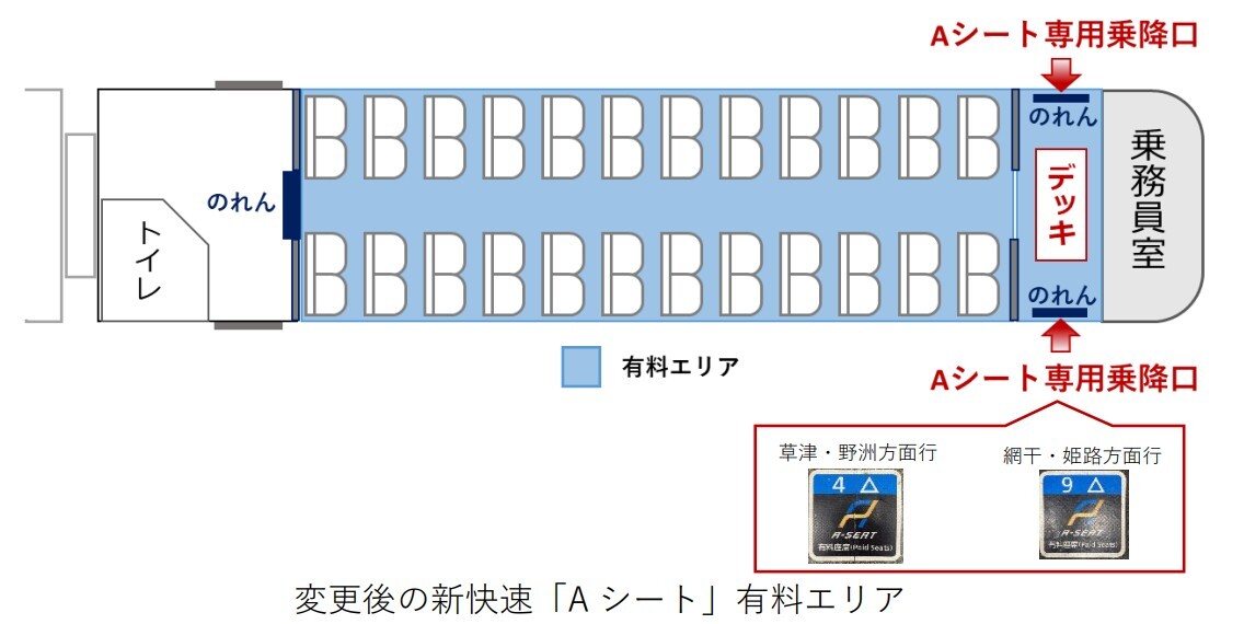 有料エリアの変更にあわせ、10月14日以降のAシートでは、専用乗降口(乗務員室側ドア)および一般車側デッキの仕切り部分に、「快速 うれしート」と同様の「のれん」を設置。