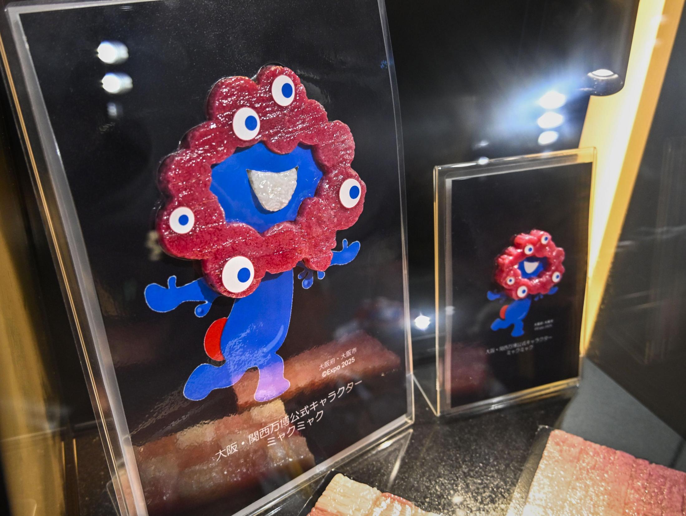 大阪・関西万博の大阪ヘルスケアパビリオンで12日、公式キャラクター「ミャクミャク」をかたどった培養肉の展示が始まった。ウシの細胞を基に作る培養肉は、人口増加による食料不足の解決策として注目されてい