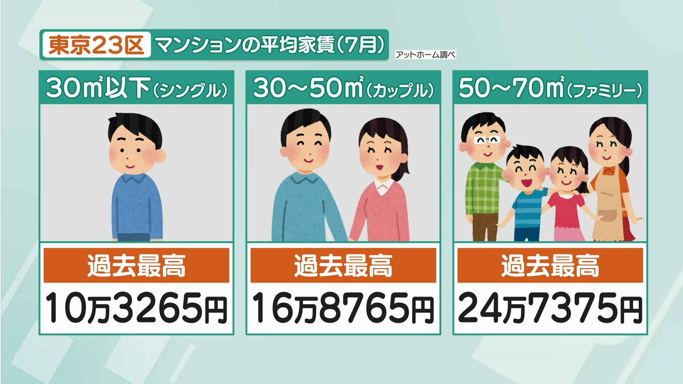 アットホーム調べによると、東京23区マンションの平均家賃(7月)は、シングル向き(30㎡)で10万3265円、カップル向き(30~50㎡)16万8765円、ファミリー向き(50~70㎡)だと24万7375円と過去最高値を更新しています。