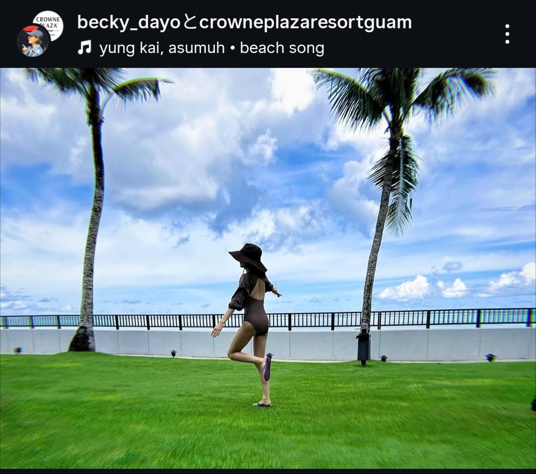 ベッキーは「グアム旅行ってきました」と、グアムで美しい背中が際立つ水着を着用し、ヤシの木と青空を背景にした開放的な姿を披露した。