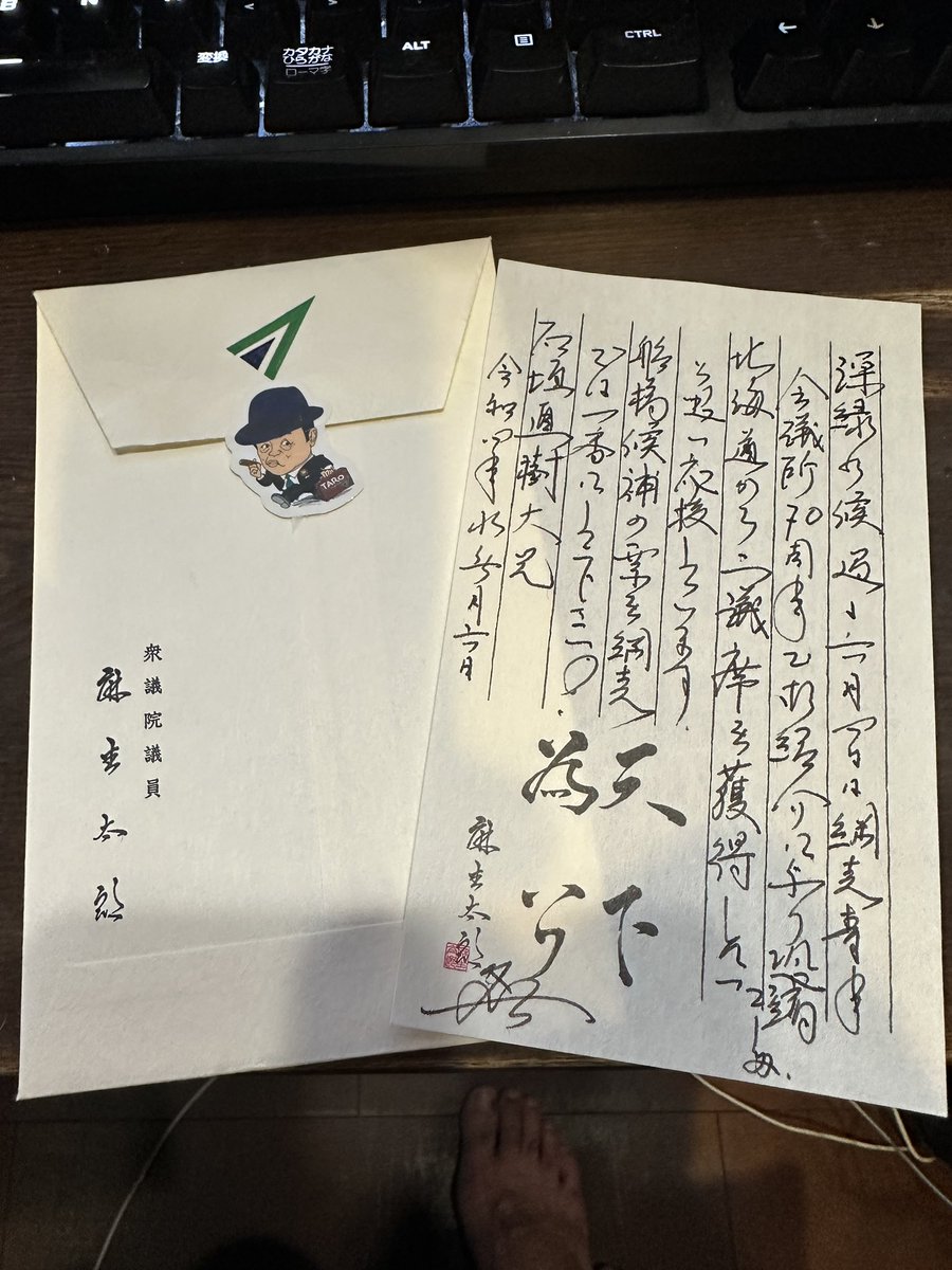 麻生氏からの手紙は令和4年に送られているもので、なぜ令和7年になった今、わざわざ公開したのか、疑問が湧く。