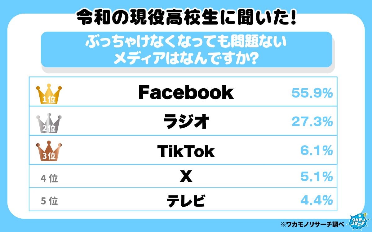 令和の高校生が思う【ぶっちゃけなくなってもいいメディア】 圧倒的1位「「Facebook」 2位ラジオ
