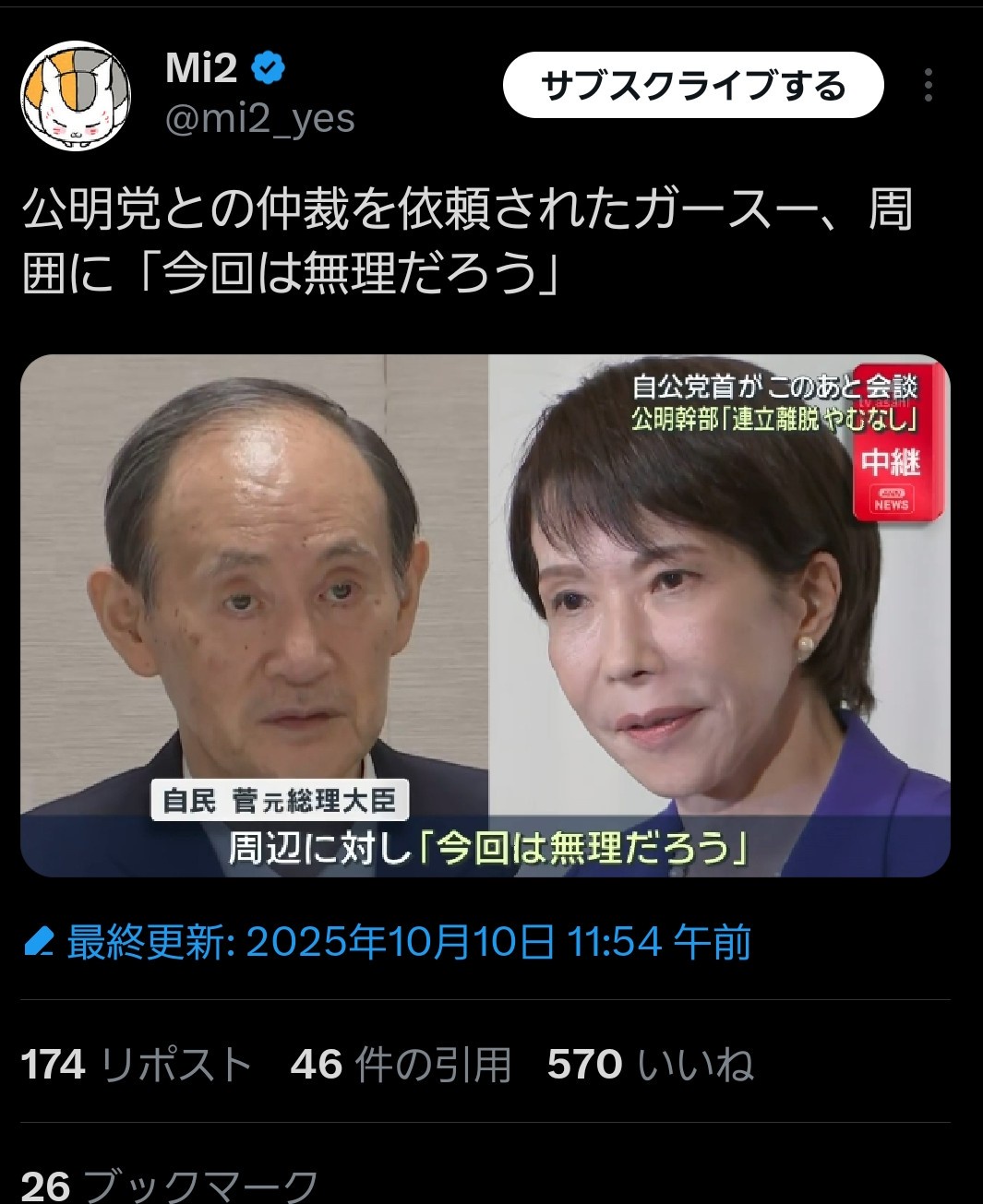 The post 高市早苗、号泣「ガースーお願い!公明党と仲裁して!」菅「残念だけど難しい。今回は諦めろ」 first appeared on Tweeter BreakingNews-ツイッ速!.