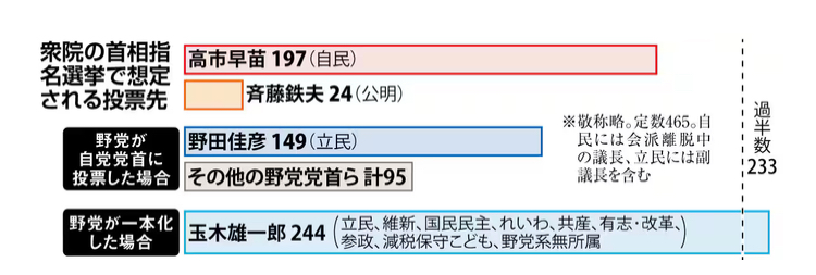 今のところ高市氏が見込める票は自民だけで、主要野党が投票先を一本化できれば高市氏を超える。今月21日を軸に調整されている首相指名選挙に向け、野党間の交渉が続く。