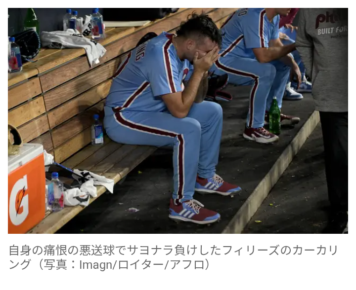 一方でカーカリングは、落ち込みベンチで両手で顔を覆った。トレイ・ターナーが隣に座って肩を抱き、リアルミュートが寄り添い、言葉をかけて慰めた。