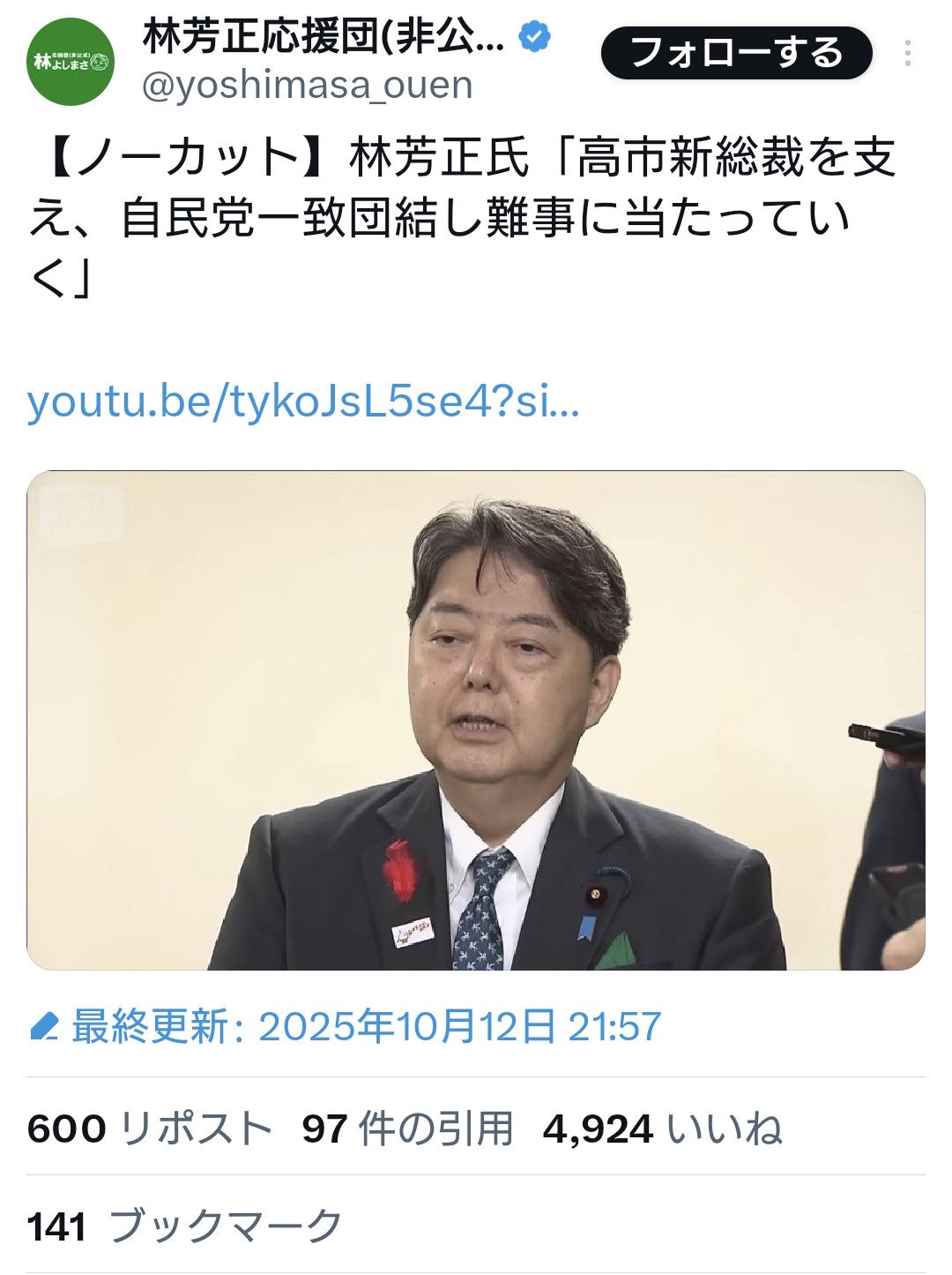 引用元: ・林芳正氏「高市新総裁を支え、自民党一致団結し難事に当たっていく」 [662593167]