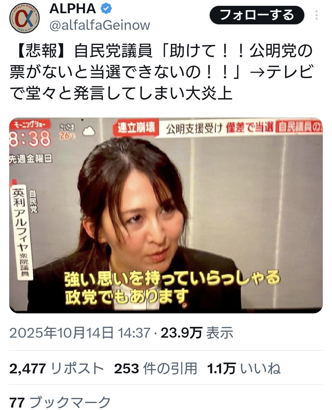 引用元: ・【悲報】自民党議員「助けて!公明党の票がないと当選できないの!」→テレビで堂々と発言 大炎上 [662593167]