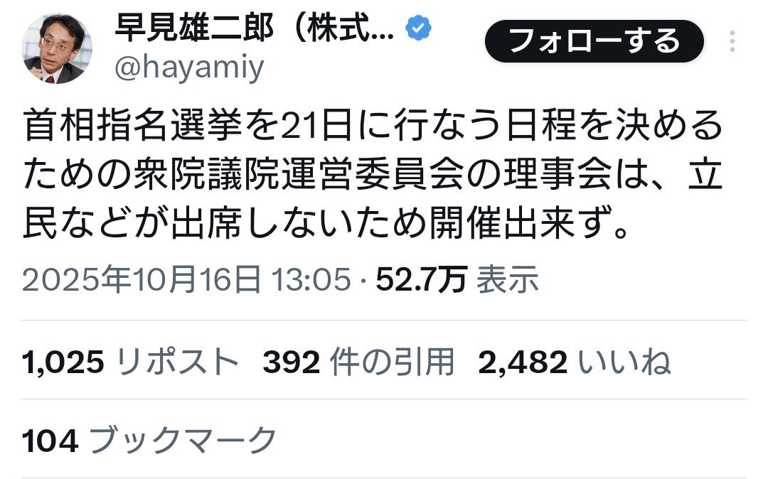 The post 首相指名選挙を行なうための衆院議院運営委員会の理事会は立民などが出席しないため開催出来ず first appeared on Tweeter BreakingNews-ツイッ速!.