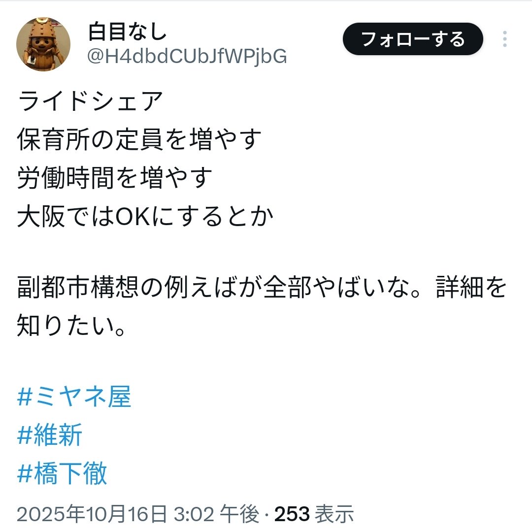 引用元: ・橋下徹「大阪だけ労働時間規制を緩和するとか、ライドシェアとか出来るようになる」 副首都の効果 [237216734]