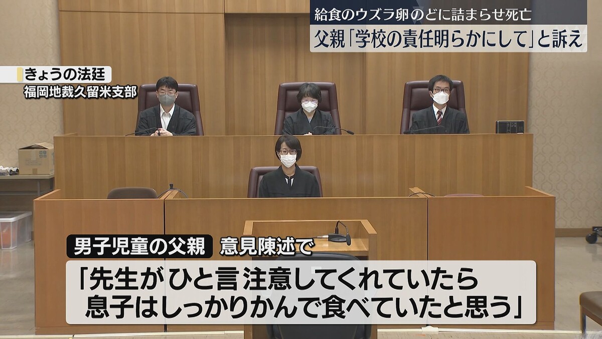 福岡地裁久留米支部で行われた第1回口頭弁論で、父親は「給食の時、先生がひと言注意してくれていたら息子はしっかりかんで食べていたと思う」「息子は7歳にして喜びも夢も奪われた」「学校の責任を明らかにしてほしい」などと述べました。