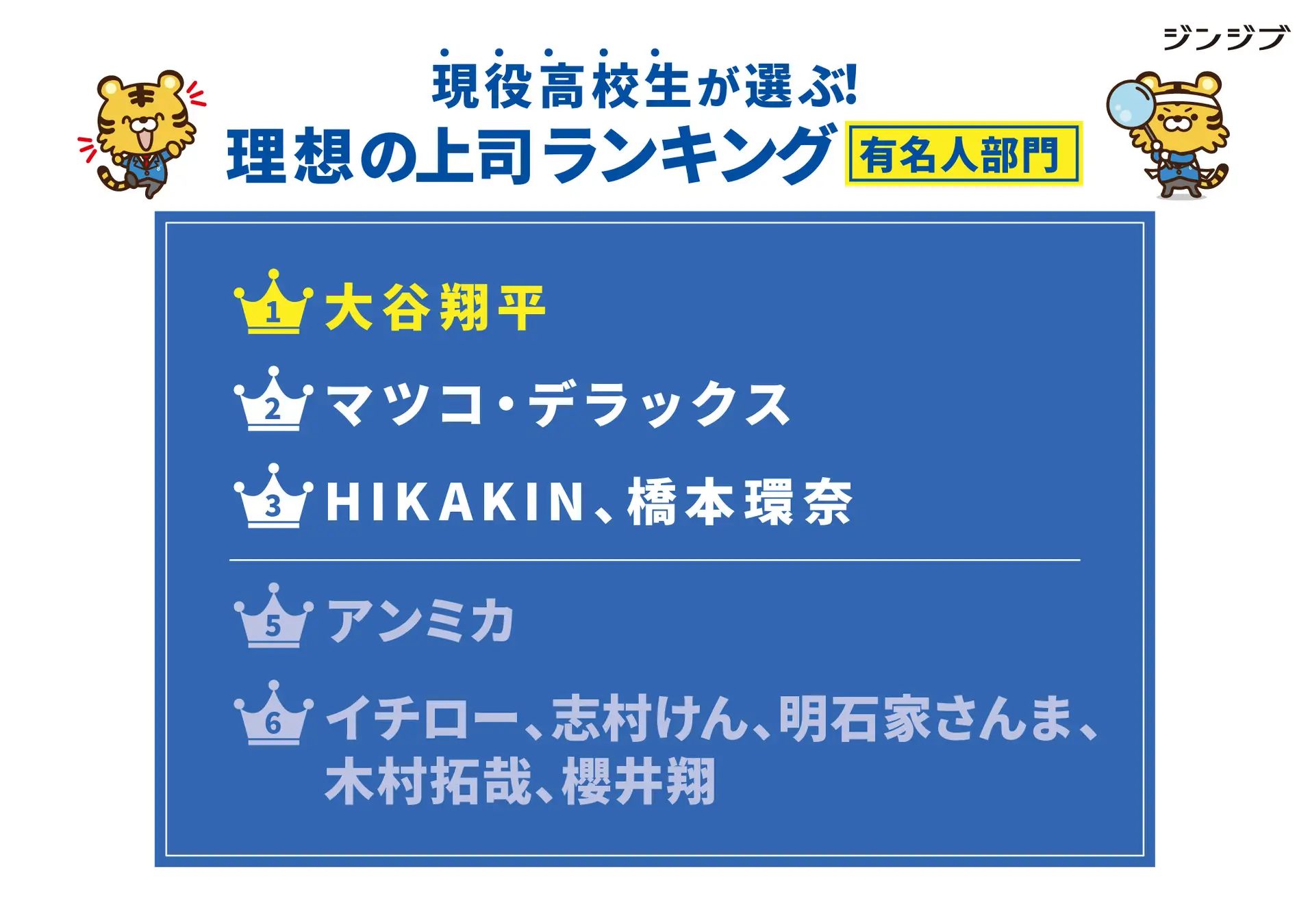 なお、実在する「有名人部門」では大谷翔平が昨年の7位から躍進して首位となった。「努力家」「思いやりがある」といった理由が挙げられている。2位はマツコ・デラックス、3位はHIKAKINと橋本環奈が並んだ。