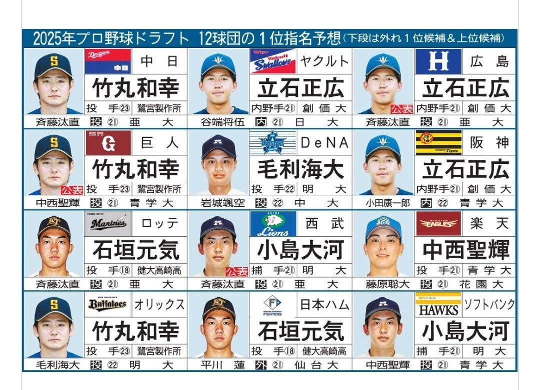 引用元: ・【速報】ドラフト会議、12球団の1位指名候補が確定