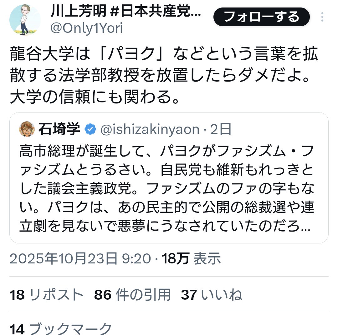 共産党支持者「龍谷大学は「パヨク」などという言葉を拡散する法学部教授を放置したらダメだよ」