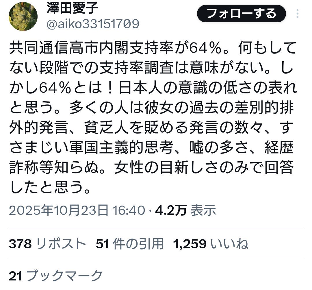 パさん「高市内閣支持率が64%とは!日本人の意識の低さの表れと思う。」 →?