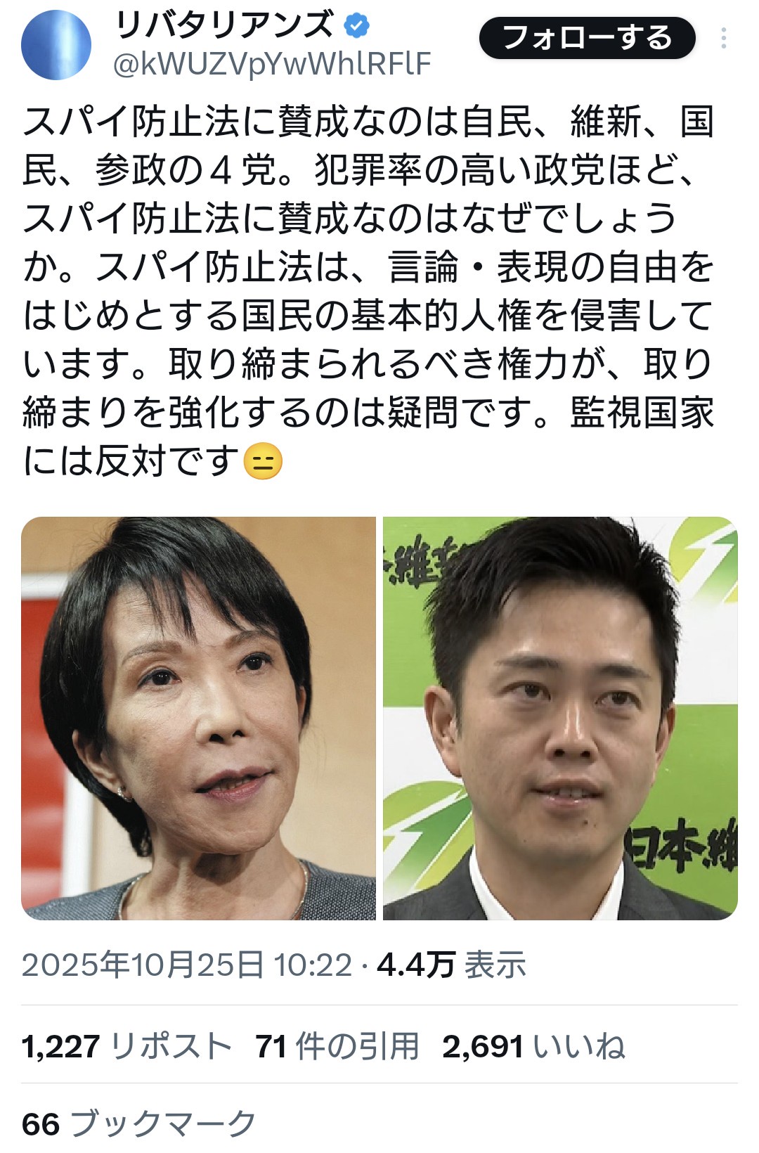 パさん「犯罪率の高い政党ほど、スパイ防止法に賛成なのはなぜでしょうか」