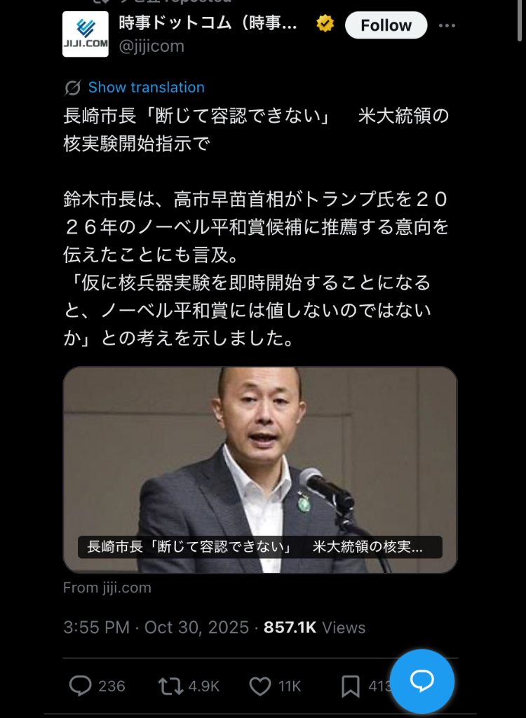 The post 長崎市長「トランプが核実験。彼は平和賞推薦に相応しくない」→高市応援団、集団で攻撃 first appeared on Tweeter BreakingNews-ツイッ速!.