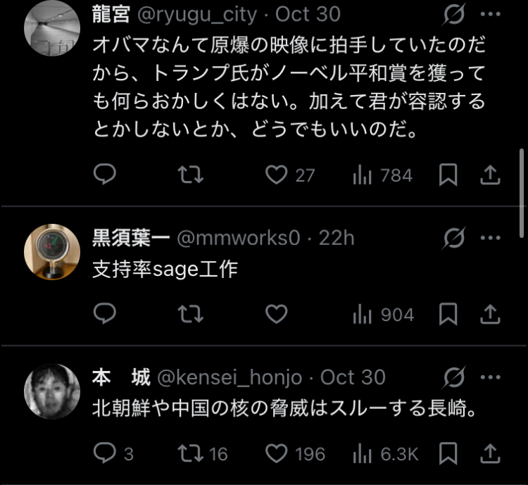 引用元: ・長崎市長「トランプが核実験。彼は平和賞推薦に相応しくない」→高市応援団、集団で攻撃 [732289945]