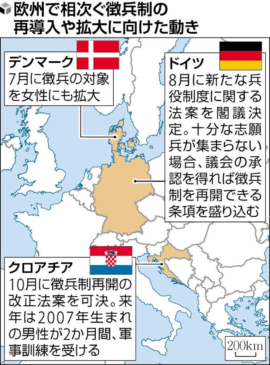 【ジュネーブ=船越翔、ベルリン=工藤彩香】欧州で徴兵制の再導入や拡大に向けた動きが進んでいる。東欧クロアチアが来年から徴兵制を再開するほか、ドイツでも条件付きだが徴兵制の復活につながる法案の審議段階に入っている。