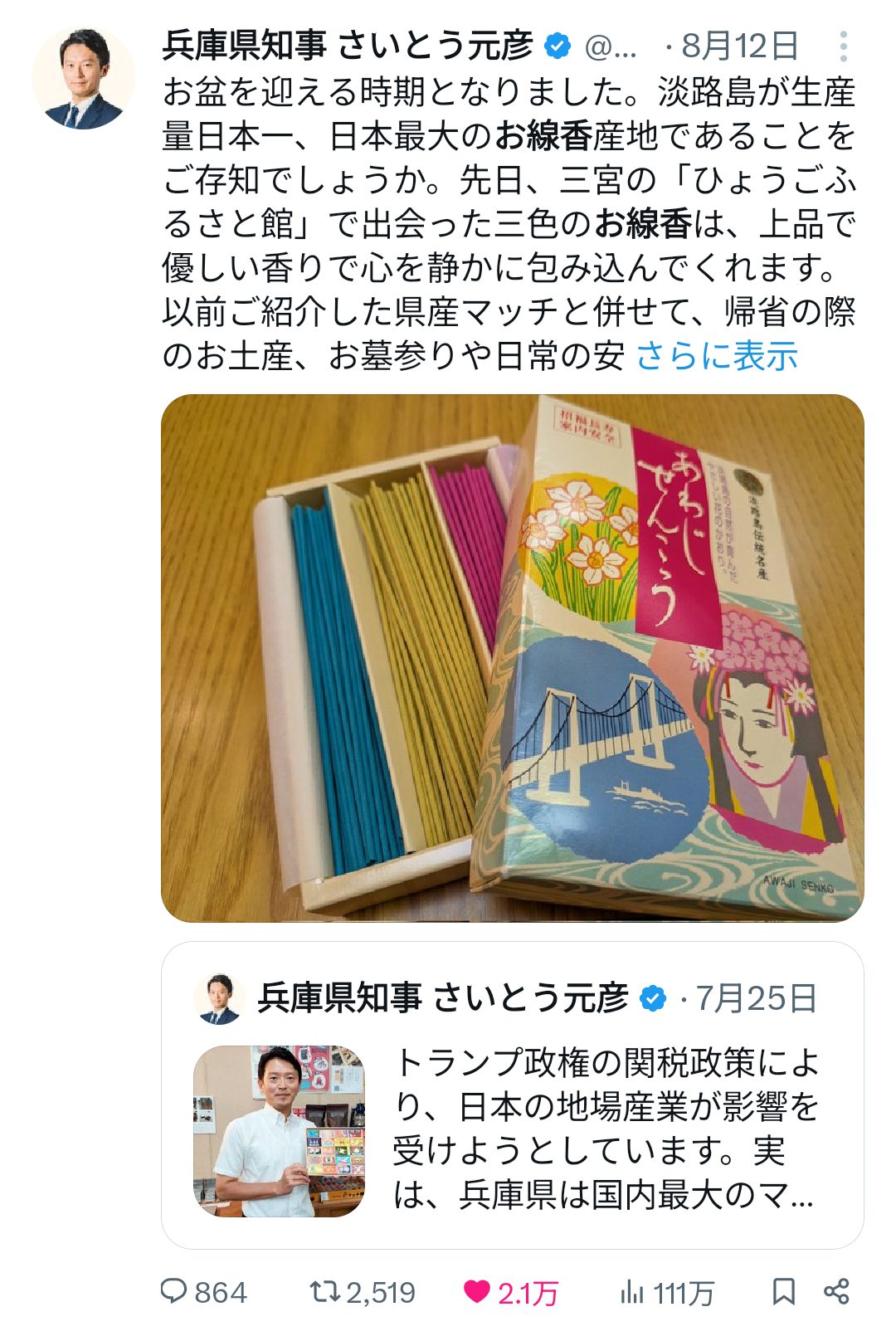 The post 兵庫県斎藤知事、地元業者の引っ張りだこに「知事がXにupしたら例年の6倍売れた」 first appeared on Tweeter BreakingNews-ツイッ速!.