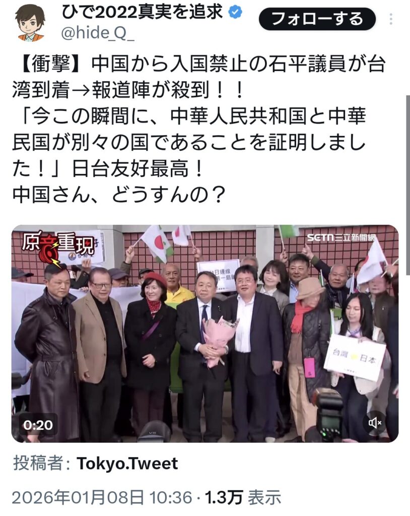 石平議員「今この瞬間に、中華人民共和国と中華民国が別々の国であることを証明しました!」