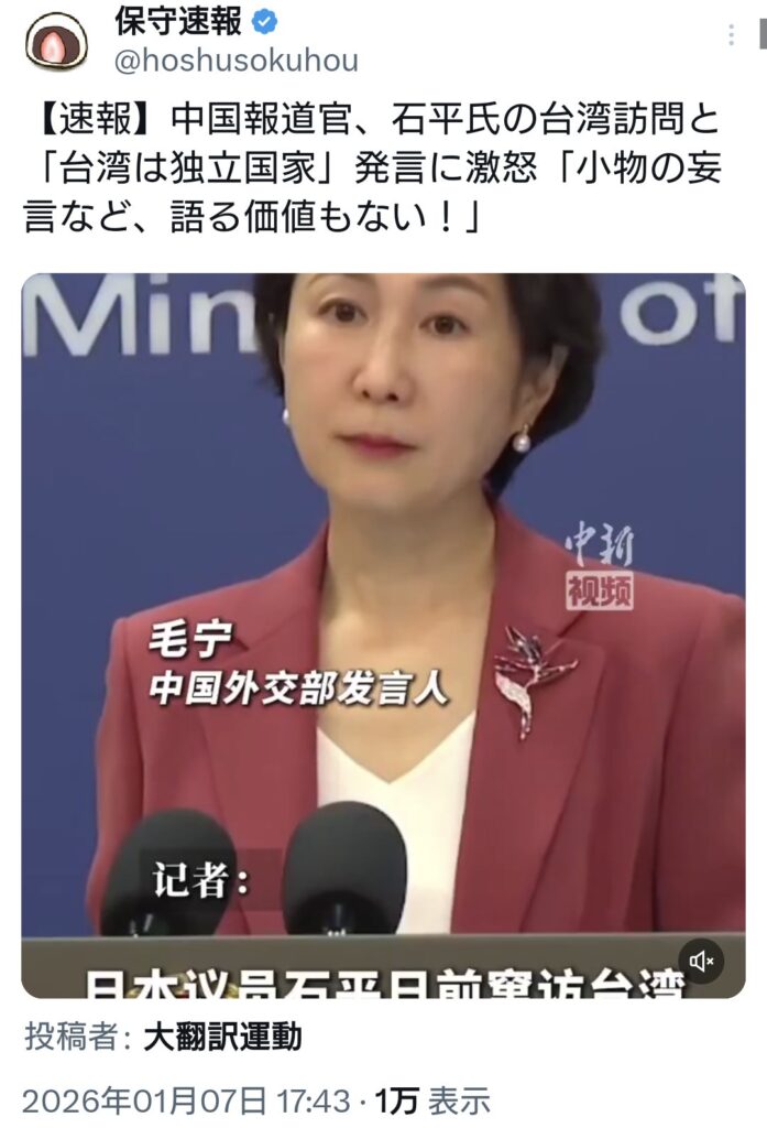 サンフランシスコ条約は無効と宣言し、台湾は日本のものと認めた中国の毛寧報道官。生存を確認