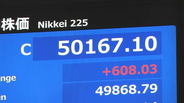 【速報】日経平均株価終値5万円回復、608円高の5万167円、出来高は19億100万株