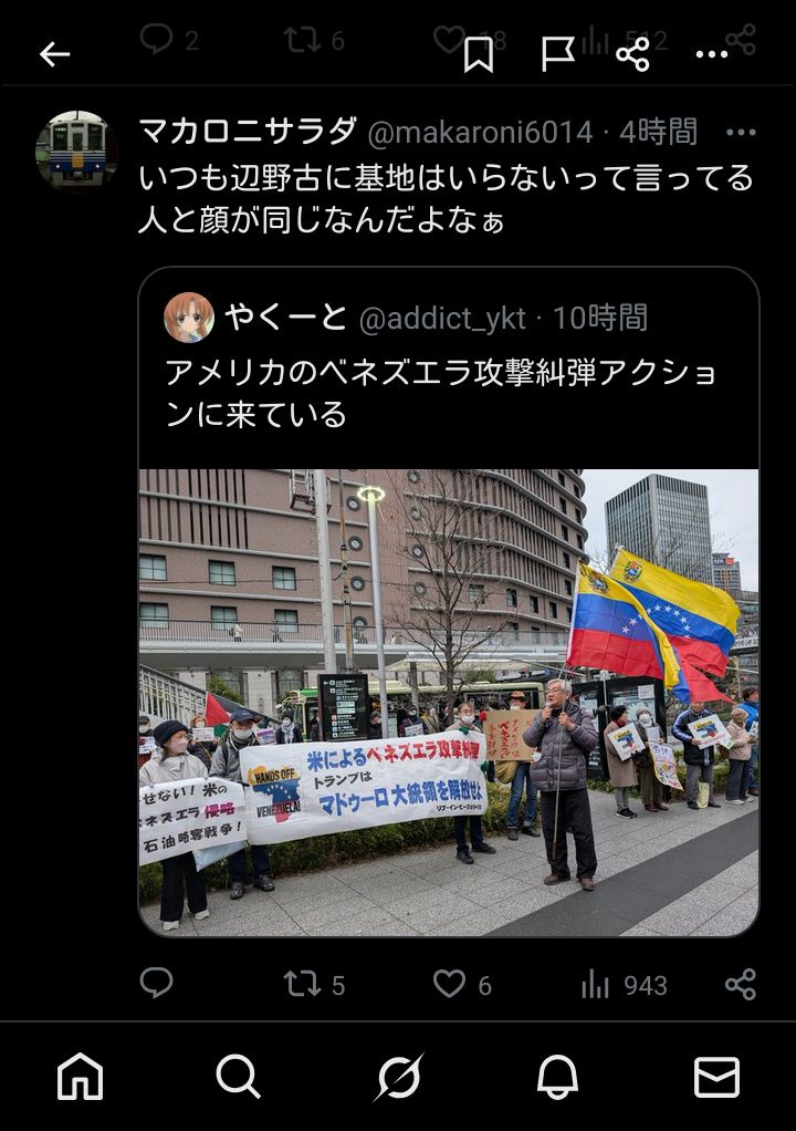 アメリカのベネズエラ攻撃糾弾アクション開催! 1: ニールキック(みょ) [NL] 2026/... -