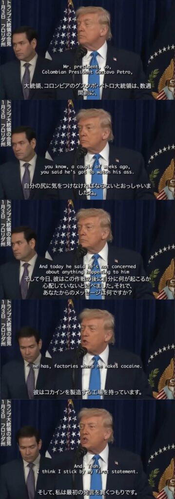 トランプ大統領、次はコロンビアへの攻撃を示唆 1: (東京都) [ニダ] 2026/01/04(日)... -