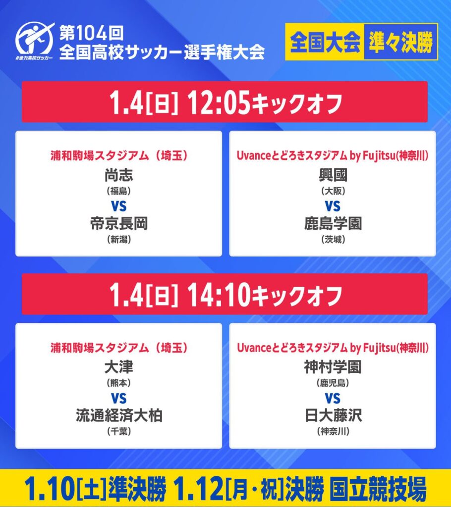 【高校サッカー】本日 4強決定 大津vs流経大柏、神村学園vs日大藤沢、帝京長岡vs尚志、興國vs鹿島学園【日テレ】